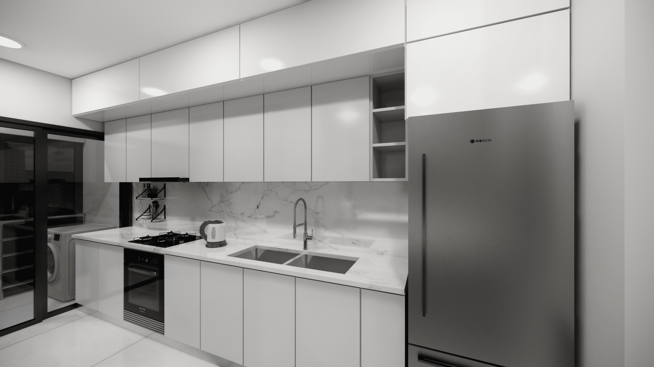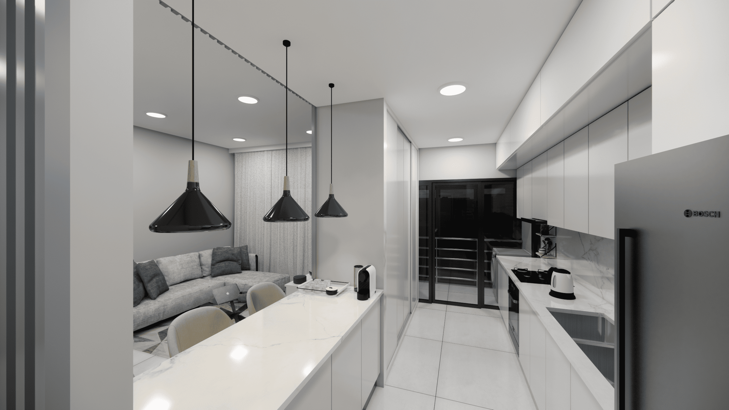 La cuisine contemporaine, aux finitions soignées, s’intègre parfaitement à l’ensemble et apporte une touche de modernité.